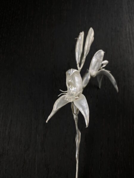 Sophie’s most recent work contemplates the relationship we humans have with our natural environment. It is also a call to arms. For example a tiny orchid which is only three centimetres tall and which would mostly go unnoticed by any passing bushwalker, has been turned into a large silver sculpture demanding of attention. Its beauty and size insisting you notice it. Likewise, the Utricularia or Bladderwort, an aquatic, carnivorous plant, rarely seen on Bruny Island and only about 15 centimetres tall, has been turned into a commanding silver sculpture. It hangs suspended on the wall as a beautiful giant specimen. Seen, unseen. Presence, Absence. Abracadabra, Going-going-gone.