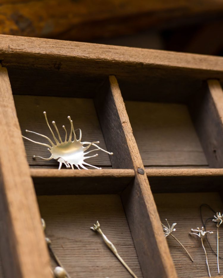 The drawers are full of foraged items from around Tasmania and elsewhere – shells in rows of matching types and sizes, bones, animal jaws and teeth, wings, pebbles, seeds, feathers, sea urchin shells, seahorses, eggshells, dragonflies, a lizard’s skin, and shark’s eggs. It felt like an eye-of-newt, wing-of-bat kind of place. And while talking to us about her silversmithing, the word ‘alchemy’ came up in jest more than once as she described what happens to the silver as she works it.
