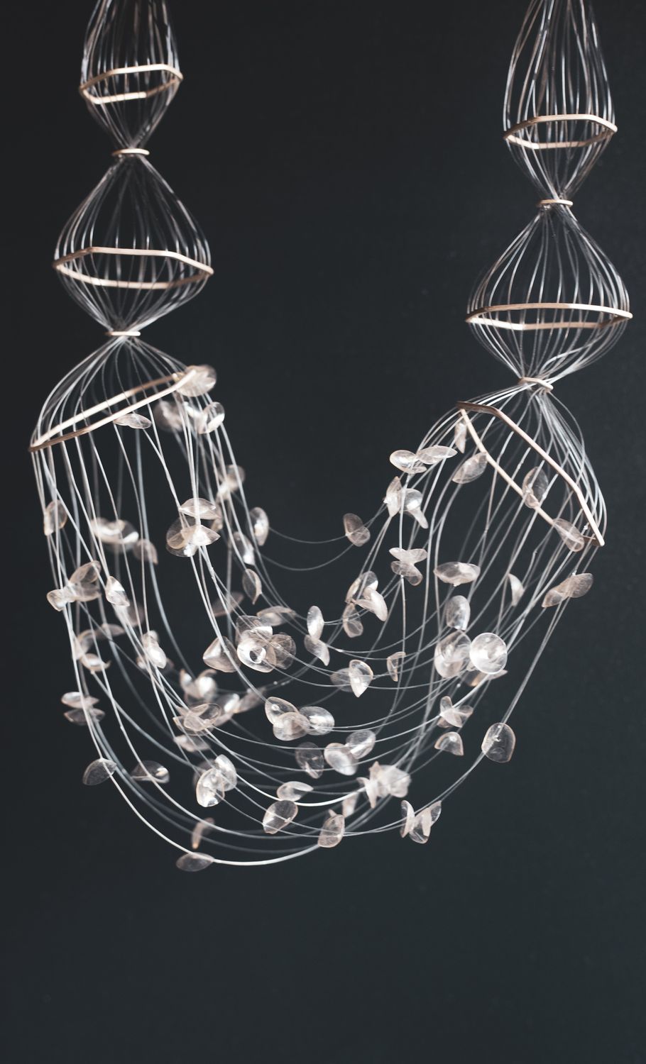 Recently she has been working on sizeable silver sculptures – large works – often for hanging on a wall: either resting on floating shelves; in open display boxes; or just suspended, creating intricate shadows. Some are isolated under glass domes.