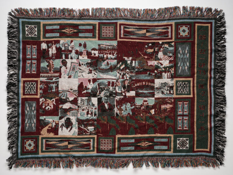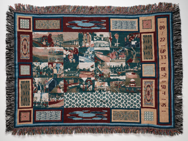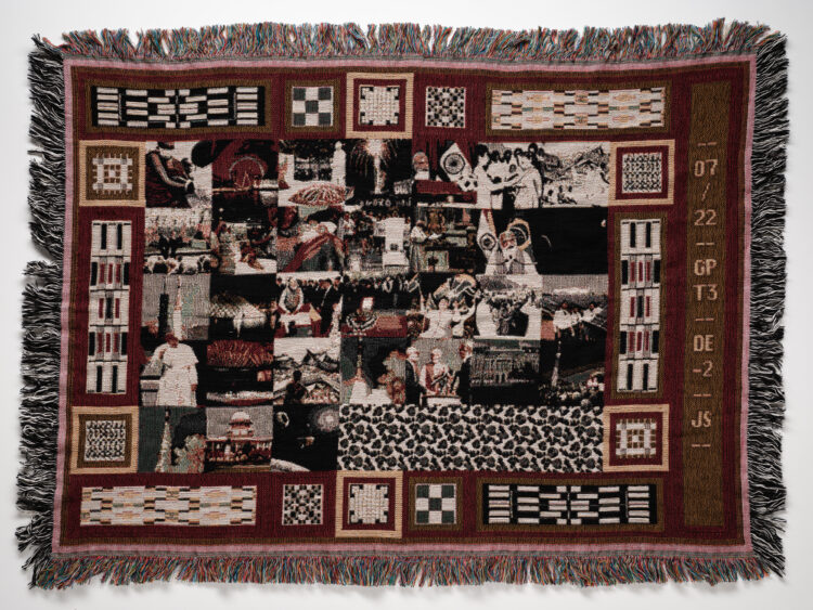 As you scan each woven cotton collage, you first notice a border of repetitive and frequently kaleidoscopic patterns created entirely by the computer. (Jonny also created a panel detailing the month and edition of the AI tool he used.) You begin to recognise the grid of news images, or rather find yourself “scraping” your own memory for familiar shapes and you make a leap as to what you are seeing: Queen Elizabeth II (the hat, the head held at a certain angle and a slight stoop), Nelson Mandela (the broad face, high forehead, those heavy-lidded eyes), President Biden the slender face with no features and suited body – possibly the American flag beside him. Is that the Statue of Liberty? Is that Saddam Hussein or just a composite face with a moustache like his?