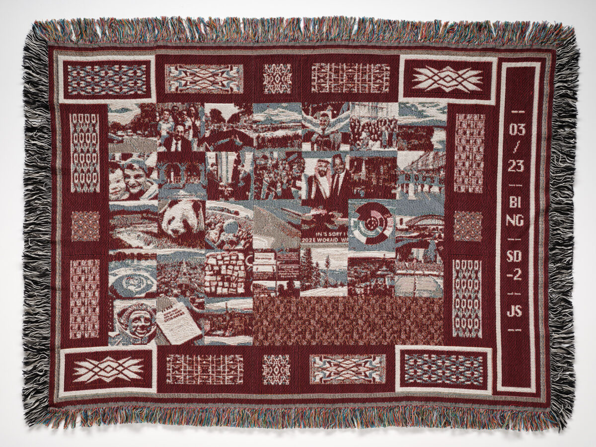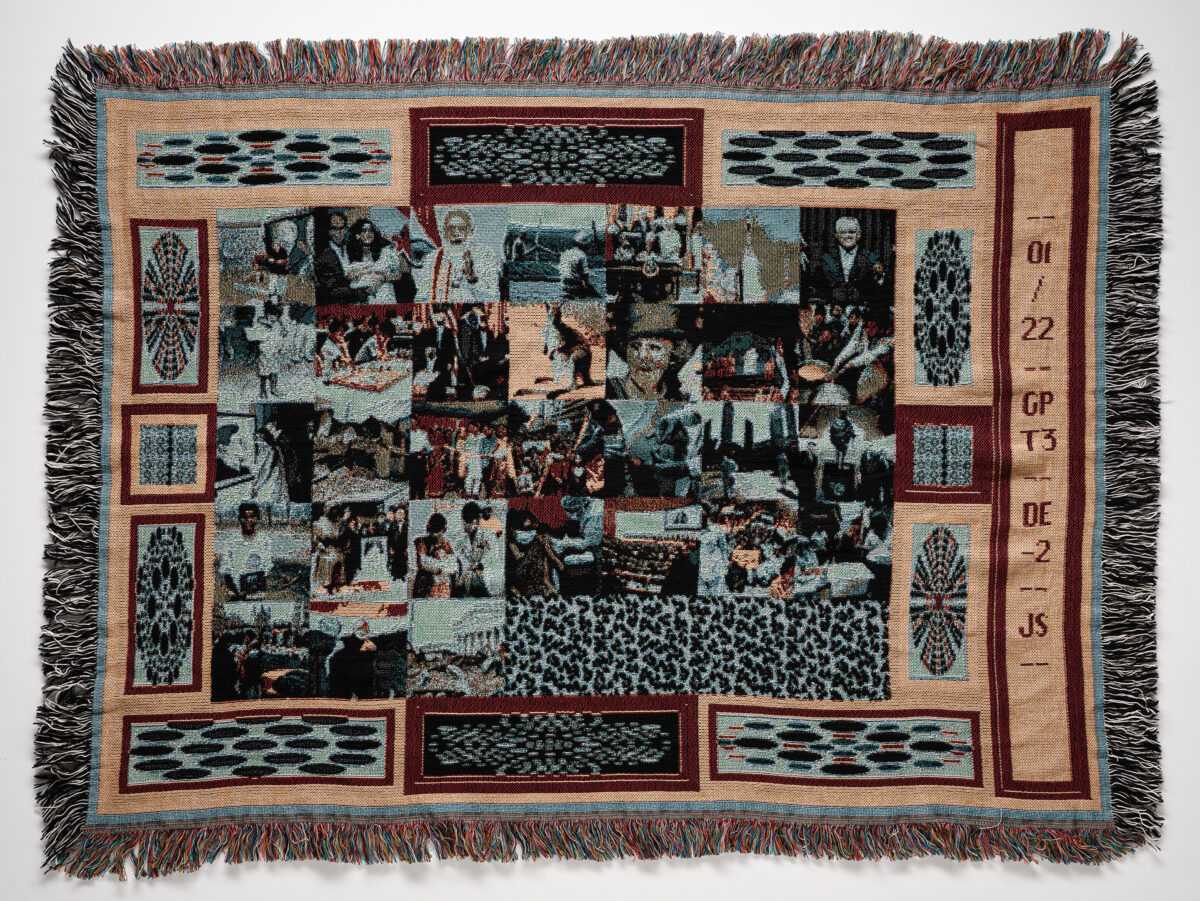 As you scan each woven cotton collage, you first notice a border of repetitive and frequently kaleidoscopic patterns created entirely by the computer. (Jonny also created a panel detailing the month and edition of the AI tool he used.) You begin to recognise the grid of news images, or rather find yourself “scraping” your own memory for familiar shapes and you make a leap as to what you are seeing: Queen Elizabeth II (the hat, the head held at a certain angle and a slight stoop), Nelson Mandela (the broad face, high forehead, those heavy-lidded eyes), President Biden the slender face with no features and suited body – possibly the American flag beside him. Is that the Statue of Liberty? Is that Saddam Hussein or just a composite face with a moustache like his?