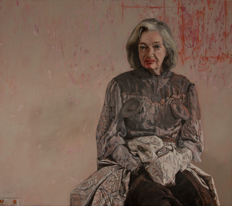 One painting of Amanda’s, which I keep coming back to, again and again, is her portrait of Pat Brassington (for which she was awarded the Portia Geach Memorial Award in 2017). I understand that they have a close friendship. And to me, the portrait itself is evidence of that. It is a very personal painting, showing her fellow artist with all the contradictory elements of an openly loved human being; looking like a vulnerable, wise, nonconformist, dressed in a secondhand wedding gown bought from an op-shop, dyed black, and worn inside out. Not all the layers of the dress took the dye well. Nylon doesn’t. The bra cups, inside out, look like mini satellite dishes, and the lips are smeared – Pat Brassington’s surreal essence is seeping out.