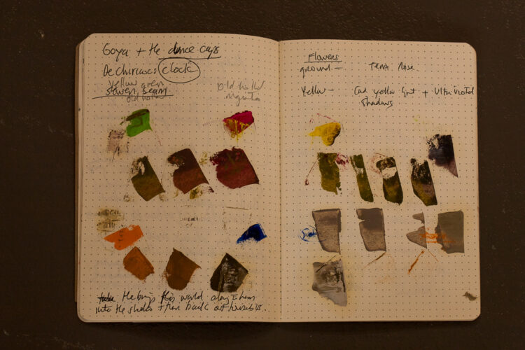 She also shows us her notebook where she has written out, and sometimes reproduced, the palettes of different artists or art periods. “I’ve put the Impressionists’ palette down. This is a classical paint palette. It gives me a base…I don’t lay my palette up like that.”