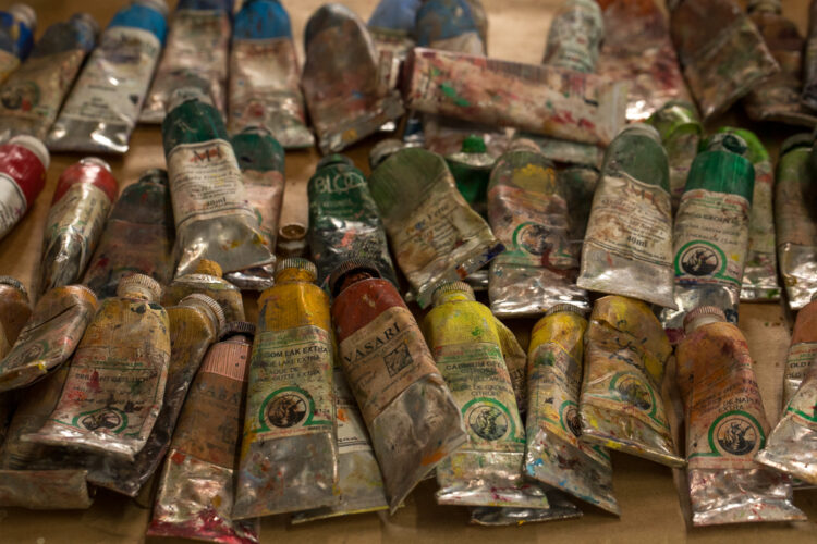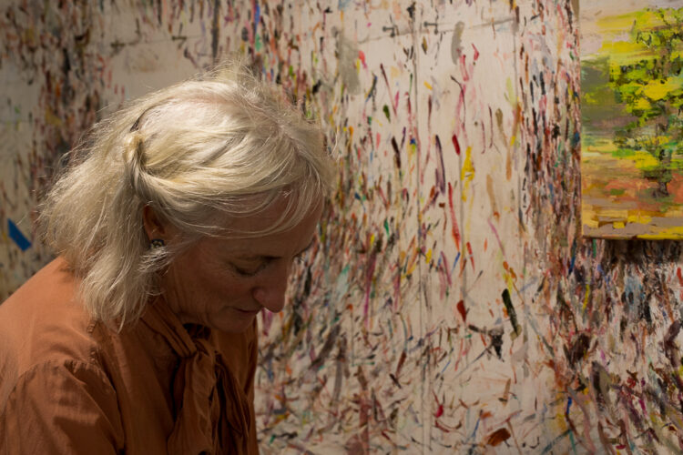 As you would expect, her studio has a large workbench covered in her tubes of paint, with large containers of low toxic paint solvent stored underneath, and a wall splattered with residual paint with screws for hanging the canvases that are in progress. She paints standing up.
