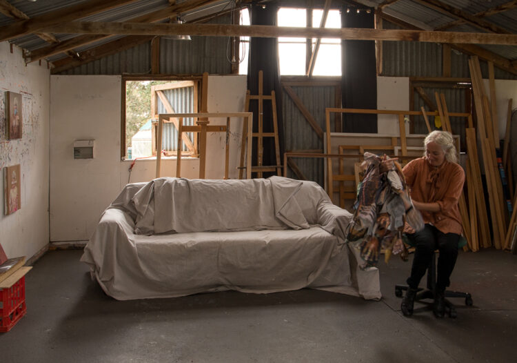 Chris and I drove the 90 minutes to the Tasman Peninsula where she lives with partner, artist Colin Langridge. The property was once, in the late 20th century, a chicken farm for breeding plump little birds for eating. A.J. as Amanda is called by friends, and Colin have converted one of a number of long galvanised sheds into a simple, elegant home; another is her studio, and another Colin’s. They grow vegetables, flowers and keep honeybees.