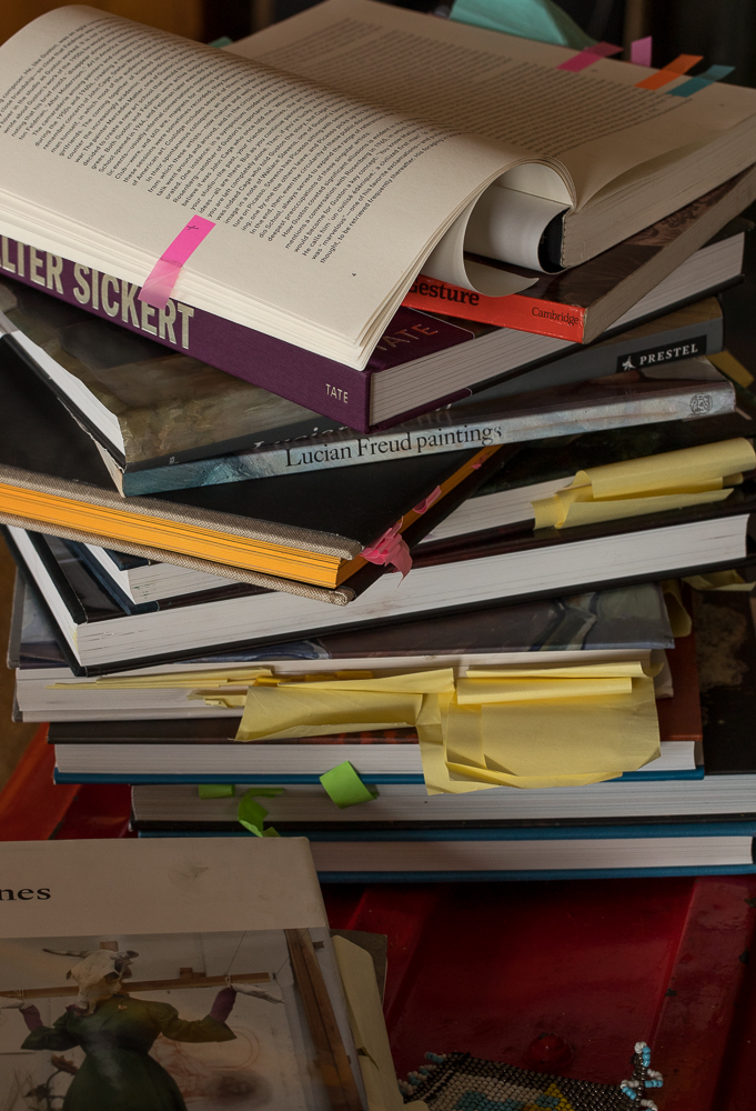 When Amanda invites us into her house, the first thing I notice is the art books – stacks of large reference books, heavily tagged with colourful Post-it notes. These are books about individual artists, which include large, coloured plates of their work that Amanda has pored over. She explains how she spends time studying how other very good painters, paint. She animatedly opens a book on Diego Velazquez, to a plate which shows off his painterly techniques. She points out the thin application of paint here, and the beautiful translucent colours there. The book is heavy with Post-it notes.