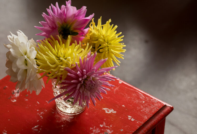 And, I don’t quite know why, but I was intrigued to see that Amanda grows Dahlias; in a hothouse all of their own. Those rather old fashioned, brightly coloured, sometimes spiky flowers which remind me, for some reason, of floral cartoon characters. A vase of these over-achievers, sat on a small table next the huge stack of art books with their protruding fluorescent Post-it notes. They are the happiest, most colourful of flowers.