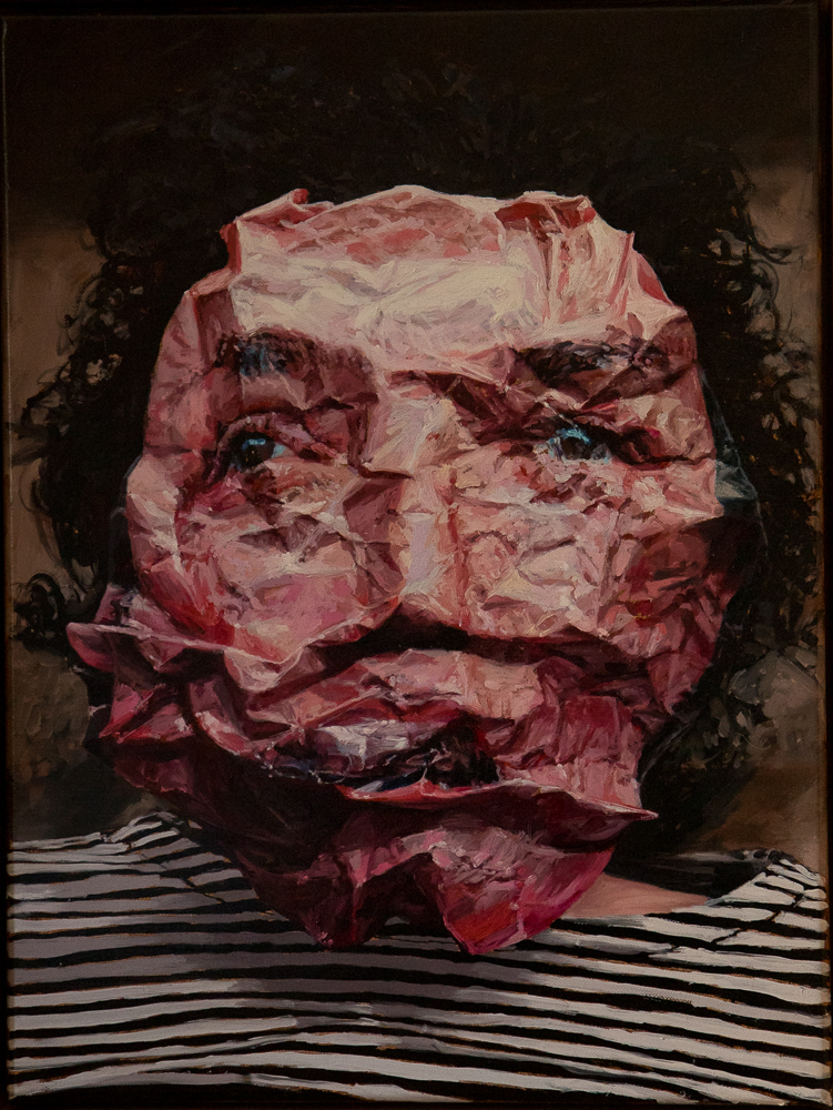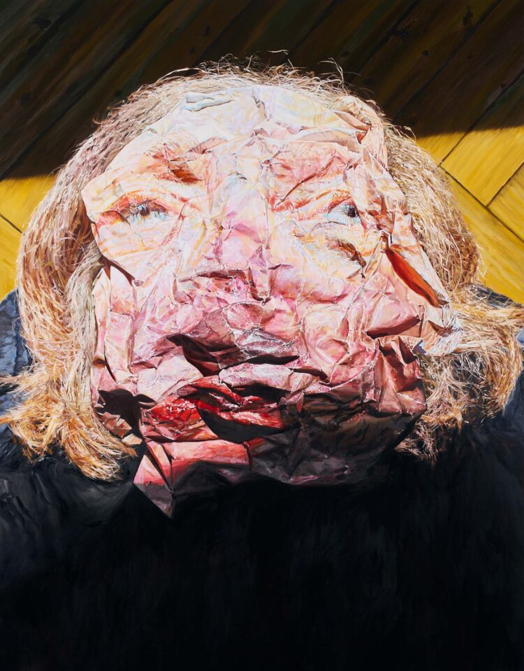 Amanda’s 2021 painting, Tasmanian Mother (again) Portrait of Lisa Campbell-Smith, is a portrait of Lisa Campbell-Smith, a curator and arts producer currently working at Contemporary Art Tasmania. Amanda first painted the portrait on paper, then scrunched it up. Finally, the scrunched up paper was placed over Lisa’s face, in the execution of the final portrait. The result is a portrait (oil on linen) that shows the fine lines of the creases on the scrunched paper – a thin veneer of a mask over the subject’s face. Lisa’s black hair (loose behind the mask) and her striped top are all that’s left of what might be immediately recognisable as her.