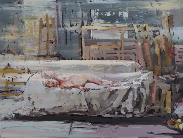 Reclining female nude (2024) oil on linen, 40 x 30cm.