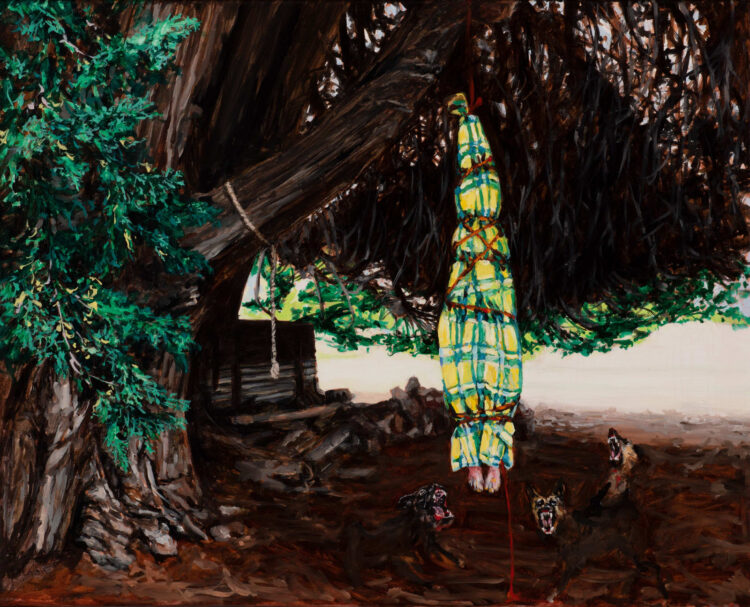I also found images of a different series of paintings Amanda was asked to create, in 2020, by actor Marta Dusseldorf’s Archipelago Productions for the Angus Cerini play, The Bleeding Tree. One included a slender shape fully wrapped and red rope-bound into a yellow and green plaid blanket suspended from a tree. Baying hounds surround the figure, fangs only centimetres away. It was viscerally frightening and yet the perky colours of the blanket draw the eye and lighten the scene. (I wondered if Amanda posed for this work. She told me later she had created the scene using a pulley system to position her body in a tree and then had it photographed.) The play has that same tension: a dark story of female survival and revenge laced with moments of wicked absurdity.