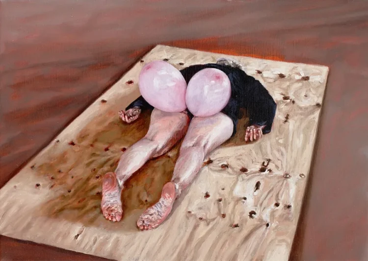 There are also images of dark humour: a red-headed woman, head and shoulders, framed into a corner with long, black condom-shaped balloons attached to her upper eyelids. A female figure prone, face down with a slick black balloon taut and oversized emerging from her buttocks. Again, that figure, same position with two pale pink balloons perkily protruding from her buttocks.