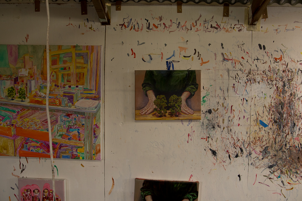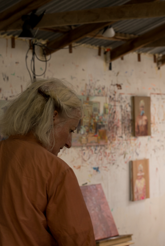 As you would expect, her studio has a large workbench covered in her tubes of paint, with large containers of low toxic paint solvent stored underneath, and a wall splattered with residual paint with screws for hanging the canvases that are in progress. She paints standing up.
