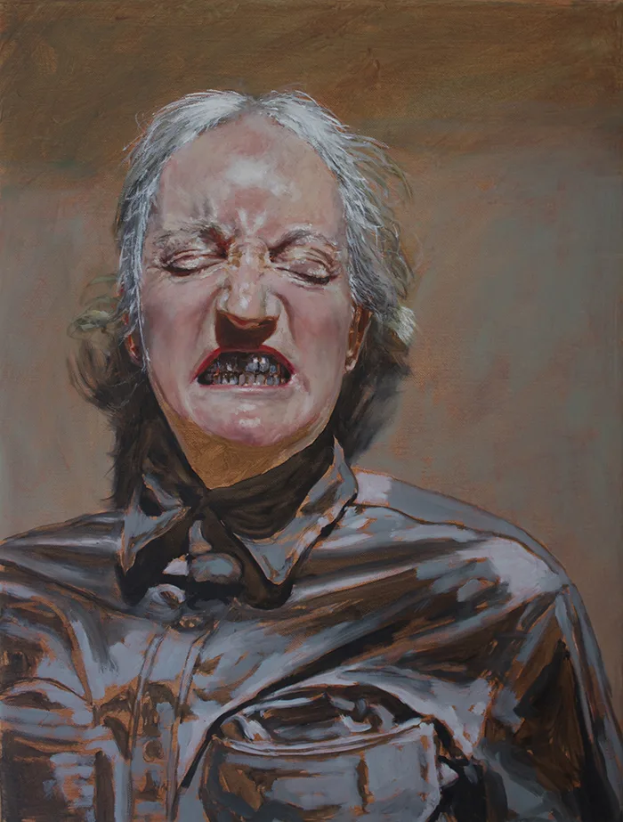 A couple of years ago, my SouthernSalon collaborator, Chris, told me about Amanda Davies, a painter she found intriguing, so I checked her works online. Some are hard to look at and even harder to talk about, others are so unexpectedly absurd that I laughed. Initially, I studied her head-and-shoulder portraits in oils: a fine featured, white-haired youngish woman. After a while I realised the images were self-portraits.