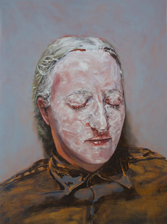 Apparently she had come across a story of a woman who inadvertently smeared some toothpaste on her face, instead of moisturiser. Toothpaste is astringent, it reddens the skin, and stings. The end result was a series of paintings with Amanda in a sliver of time and emotion. Vulnerable. A transcendency of sorts.