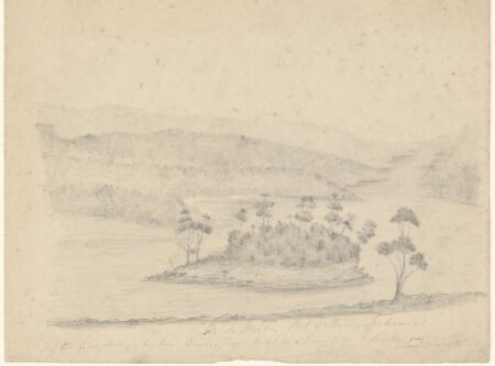 Catherine Augusta Mitchell’s pencil drawing of the Isle of the Dead where her two baby boys are buried. Image courtesy of the Allport Library and Museum of Fine Arts Collection.