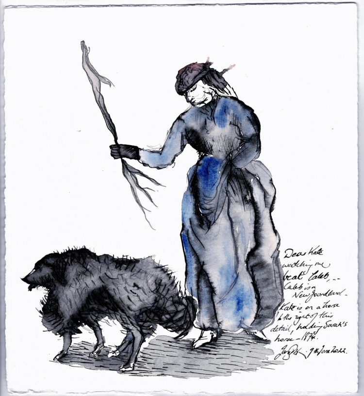 Kate puts herself into most scenes: cooking chops over an open fire during a seaside picnic; poised with her fishing rod before launching herself off a log onto boggy soil; threatening to pour hot tea on two boys torturing a March fly; attending dances; wading thigh deep in her full skirt in the sea to bring a boat to shore; or heading out with her drawing book and her dog Caleb, carrying her easel strapped to his back.