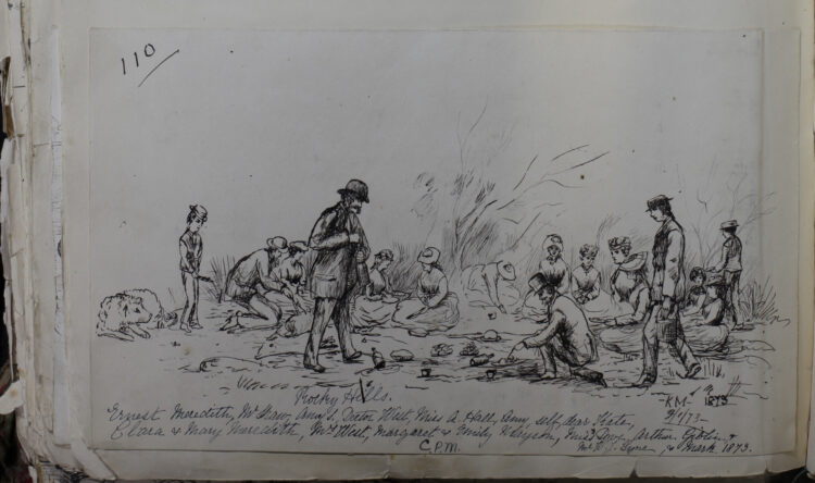 Sarah’s note: “Doctor West draws a cork”. Kate’s close drawing enabled Sarah to identify each of the guests, and note their names, years later. Drawing dated 1873.