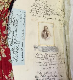 Sarah Mitchell scrapbook: inside front cover showing image of Catherine Penwarne Mitchell and John Aubrey Ball, engagement announcement in 1877.
