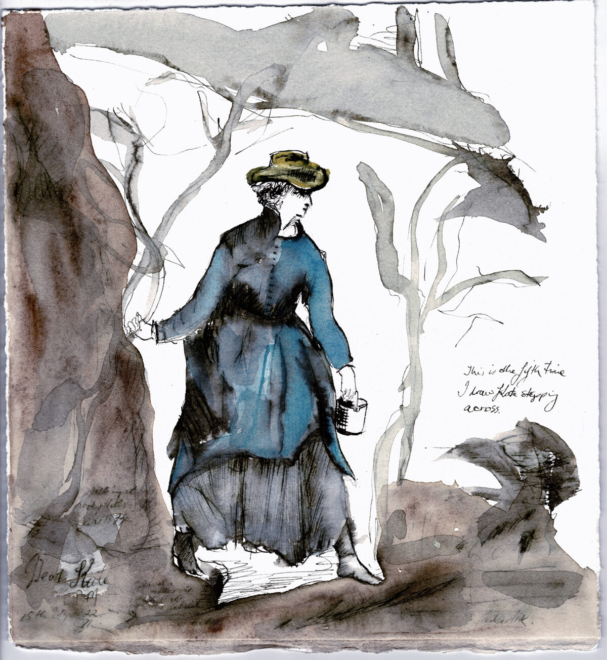 “I started with her ink drawings, first, and I take an element that I respond to with very little thought. I looked for evidence of her particular skill…but then as time went on the story became more important than her mark. I was intrigued, for example, to capture the moment they were chasing sheep, there’s a possum she’s drawn in beyond her figure. And there’s her imaginative brilliance: drawing the women falling off the cart. Or the little moment when Kate is standing near a bog and there’s a little tiny dog standing beside her. She’s carrying the fishing gear, and [her figure] is only a centimetre tall, but everything you need is there. She’s tentatively standing on the edge of a swamp and being told to ‘Come on’. I am right there in the scene with her.