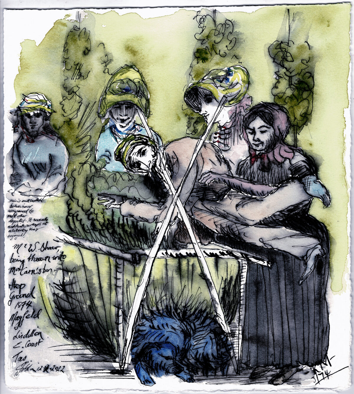 And Sarah notes in her reminisces that Kate “was a wonderful rider and used to jump fences with ease and break in horses”. And the real-life consequences are also graphically recorded: Kate draws the women tumbling from their horses or from the carts they are driving. Sarah writes of scraped faces and broken arms and fingers but rarely serious injury. Kate draws their 4 am departures from Lisdillon on horseback for a three-day journey to Hobart. The sense of their spirit and energy is palpable.
