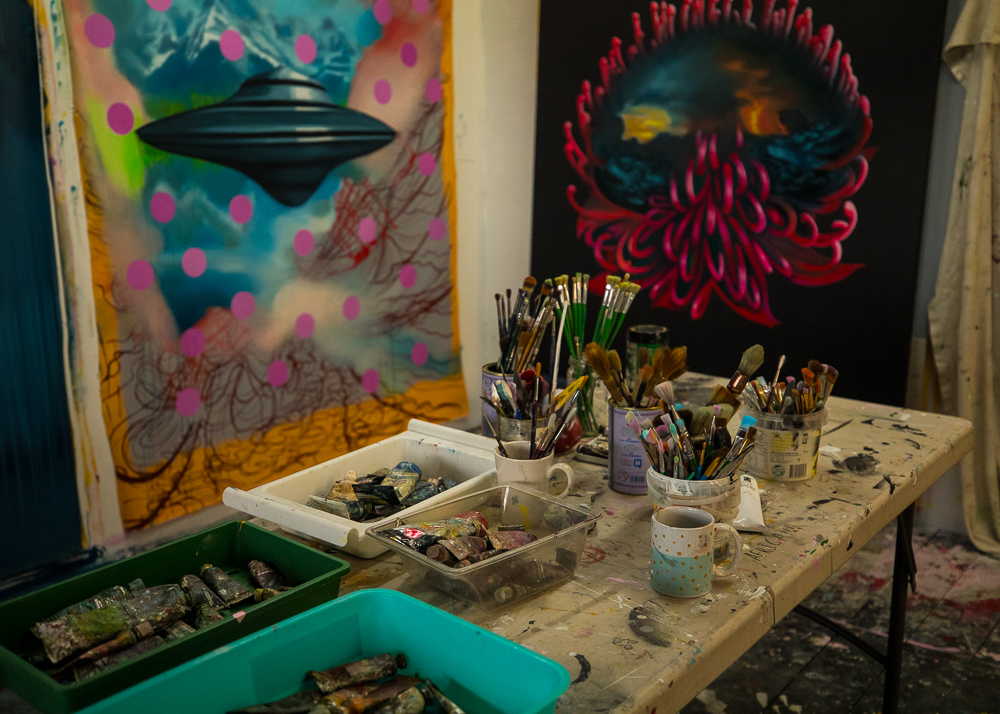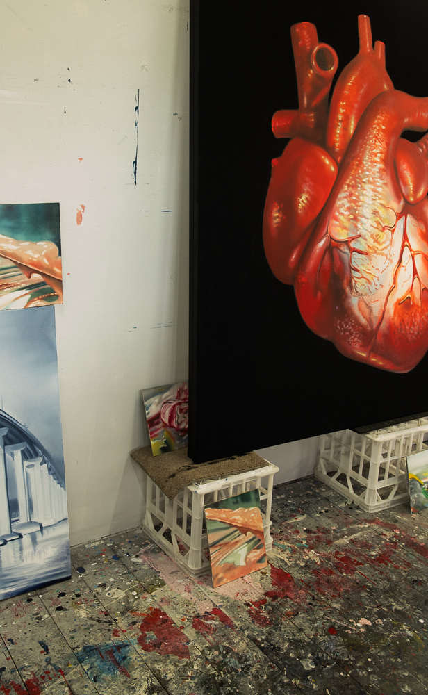 Megan has been painting outer space: UFOs, space ships, asteroids, cosmic dust particles and strawberry moons; and inner space: crab holes and enormous human hearts. They are wildly experimental, some shock with carnal colours. She gives the viewer something to chew on in her depiction of spheres and atmospheres. They are ethereal, with a humorous dose of “what the fuck?!”